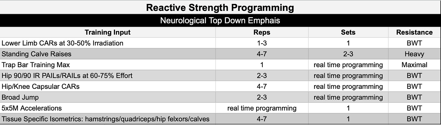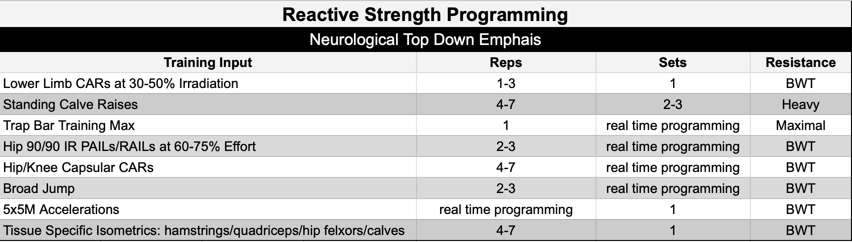 In attempting to maximize the product in each training session, an example for an athlete that requires more neurological output may look like this: